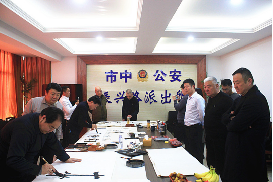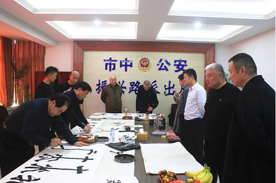 此次活动的促成,离不开文化桥梁的精心搭建。受新华社客户端中国名牌观澜栏目市场调研主任、中国新时代党建新闻网社长助理、党建头条客户端区域主任、中国数字电视CCTV《法制与经济》栏目群联部主任王海涛的诚挚邀请,多位艺术造诣深厚的书画名家走进了这片承载着忠诚与担当的警营。他们中有著名演员马子俊,有因其画作“五岳独尊”成为国家名片——第五套人民币五元面值图案而广为人知的中国美术家协会会员李叔平,有以独特左书艺术闻名的中国书画界联合会会员、左书艺术名家史双柱,还有翰墨精深、享有盛誉的中国书法家协会会员、国家一级美术师、中央美院客座教授刘啸泉。他们的到来,为平日严肃紧张的警营注入了浓郁的人文气息与艺术活力。市中区公安分局振兴路派出所所长李小鹏全程陪同,对艺术家们的到来表示热烈欢迎,并期待此次活动能进一步滋养警心、凝聚警力。